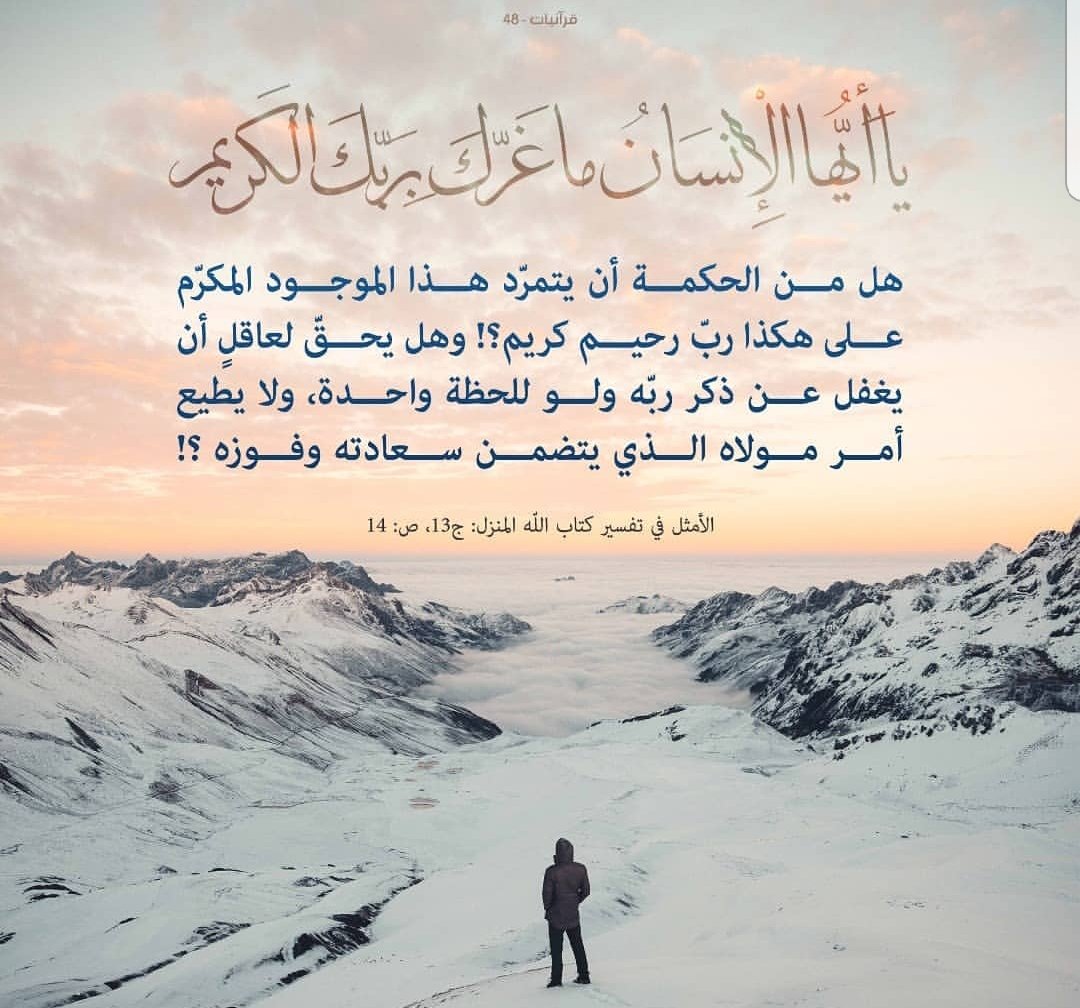 سيد العلوي A Twitter ي ا أ ي ه ا ال إ ن س ان م ا غ ر ك ب ر ب ك ال ك ر يم وردت الآية الكريمة في سياق الحديث عن أحوال يوم القيامة والبعث بعد الموت حيث ذكر الله تعالى قبلها صورا