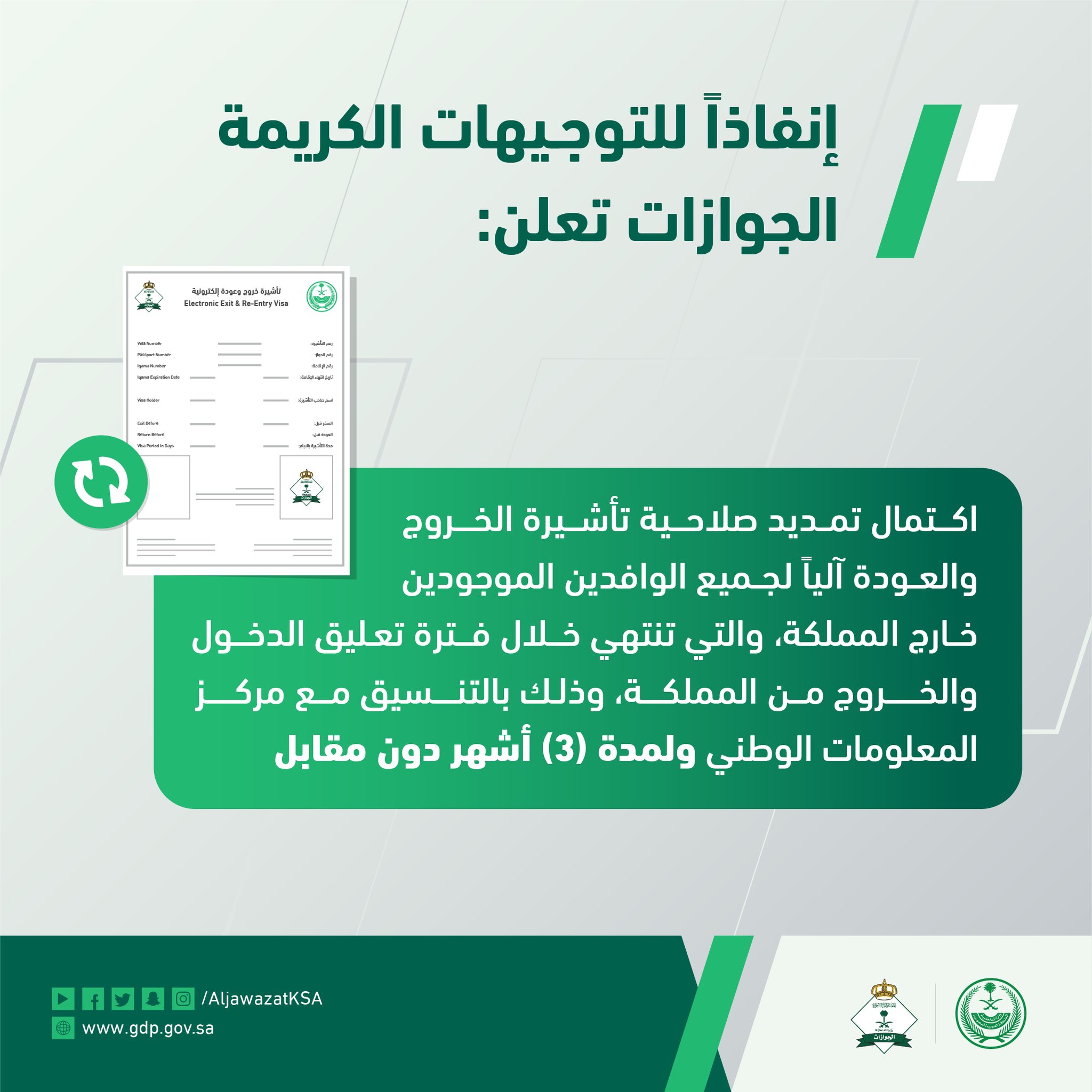 إتمام للخدمات On Twitter تنويه أعلنت الجوازات عن اكتمال تمديد صلاحية تأشيرة الخروج والعودة آليا لجميع الوافدين الموجودين خارج المملكة والتي تنتهي خلال فترة تعليق الدخول والخروج من المملكة وذلك بالتنسيق مع مركز